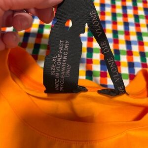 Vibrant orange VLONE tee. Features bold black lettering. Ideal for streetwear style.