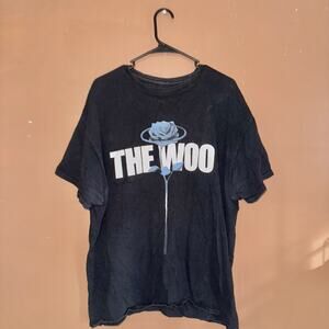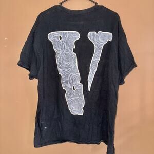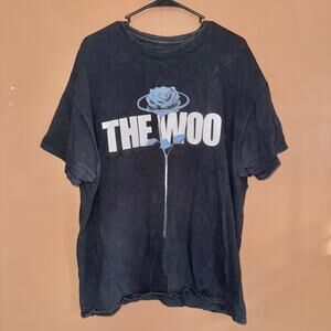This black tee, size XL, features a striking grey VLONE logo alongside the iconic "The Woo" album art on the front. The shirt is in great condition.