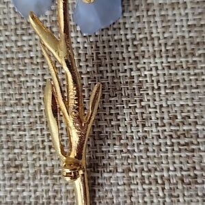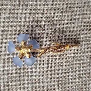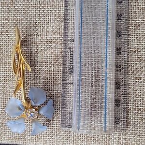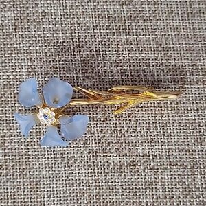 blooms in your heart. This Brooch features a gorgeous blue lucite lily flower, accented with delicate crystals in an elegant gold tone stem finish. There's a strong locking pin at the back that functions properly. Marked VFMA on the reverse. The 2.5- inch brooch is made of durable metal for years of enjoyment.