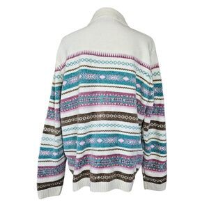Add a pop of color to your wardrobe with this vintage 90's Alfred Dunner Fair Isle full zip chenille sweater cardigan in plus size 1X. The cardigan features a collared neckline, long sleeves, and a regular fit. The multicolor pattern and retro style make it a perfect addition to any outfit. Made of acrylic material, this sweater is both comfortable and durable with its full zip feature that make it a versatile piece for any occasion. Don't miss out on this unique and stylish cardigan that's sure to turn heads.