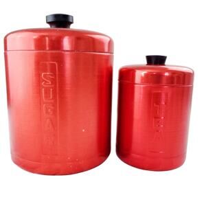 This vintage 2-piece MCM aluminum tin SUGAR & TEA canister set is a charming addition to any kitchen. The red, twist-off lid canisters feature a retro design with a solid pattern and are made of metal for durable storage. With a cylinder shape and medium size, these canisters are perfect for organizing and storing dry goods in a stylish way. Made in the United States, these original vintage kitchen canisters are a unique collectible item that adds character to your kitchen decor.