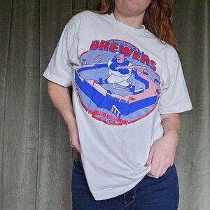 Vintage 90's white cotton single stitch tshirt with a large Milwaukee Brewers graphic on the front.