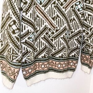 Vintage T.Q. 80s 90s abstract geometric tribal Aztec oversized sweater. Crewneck pullover. Soft fuzzy and warm medium weight. Size medium. Made in Taiwan