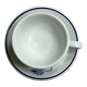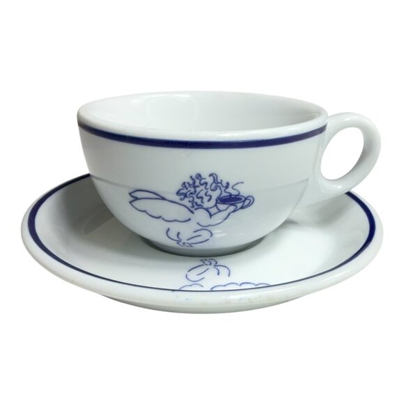 This vintage espresso cup and saucer set from 1994 features a charming blue angel design. Exclusively crafted for Starbucks by Rosanna Imports, it exudes timeless elegance and collectible appeal.