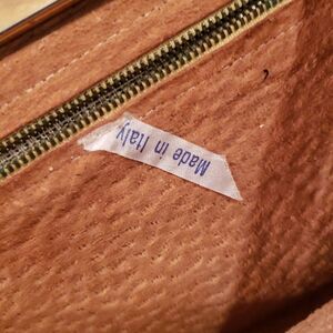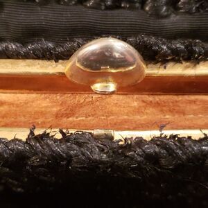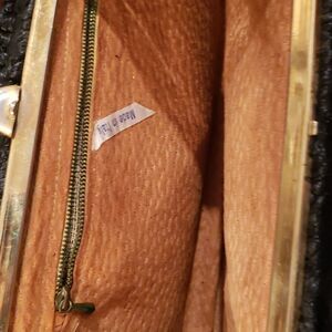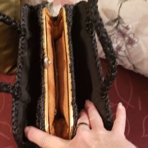 Gently used condition, vintage 1950's, black woven material, double handles, 1 main compartment with tan suede leather interior, 1 interior zipper pocket, 2 additional exterior pockets, brass colored snap closure