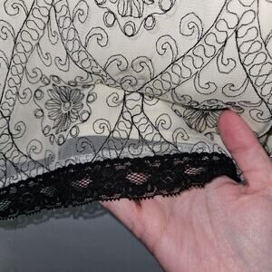 VNTG 90s R.Q.T Sheer Cream/Black Low Rise Skirt Black Mesh Overlay with Cream Lining. Size Large Lace Trim. Elastic Waist. Excellent condition. Whimsigoth 100% Polyester.
