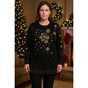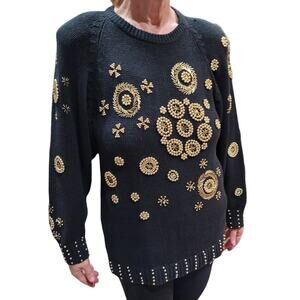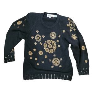 Statement sparkle straight from the 90s — this Western Connection knit is true vintage with heavy glam details. Black ramie-cotton base loaded with gold metallic beading and pearl accents in circular geometric patterns. Shoulder pads give it that iconic silhouette, and the shimmer effect makes it perfect for holiday parties or vintage collectors.
