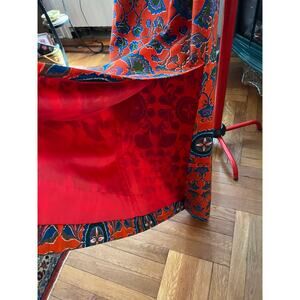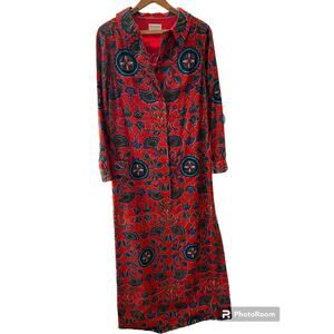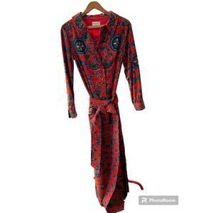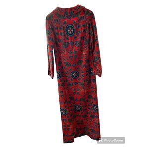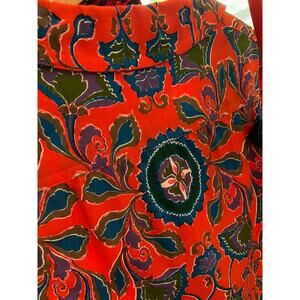 Beautiful lined Abercrombie 100% Wool, hand screened dress. Item is collared, has long sleeves that button at wrist and a 5 front button opening front before full closure just a bit below waist. Dress has two big front pockets and a gorgeous 3 inch wide belt. There is a substantial slit on left side. Gorgeous. Item is in excellent condition. Colors are vibrant and crisp. Happy to answer any questions on piece.
