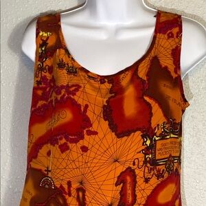 VNTG Anne Pinkerton 100% Silk Map Themed Top Orange and Red Sleeveless