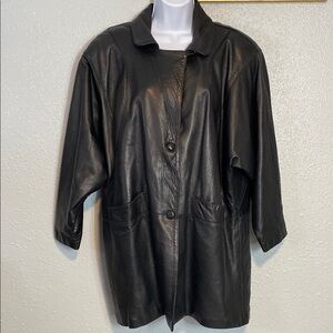 This vintage black buttery soft leather jacket features a loose-fitting, oversized style with a classic collar and lapel design. The soft, supple leather offers a slight sheen, while the straight, boxy cut provides a modern silhouette. Its mid-thigh length makes it a versatile addition to any wardrobe. Excellent condition. Pit to pit 27”. Shoulder to hem 34”.
