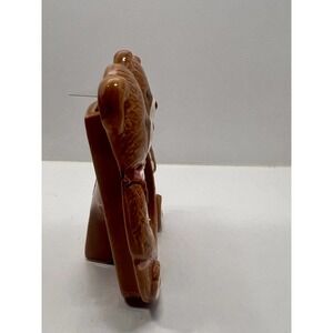 This adorable bear picture frame holds a small picture in the window. Will fit appx a 3x5 photo. There are no chips or cracks. The colors are vibrant and the frame itself is in good condition.