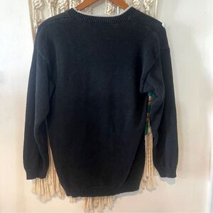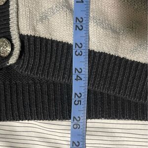 Details: Relaxed fit, tight-knit, button front. Black w/white trim aroud v-neckline. Raime & cotton blend. Adorable knitted Christmas scene on the front, with snow covered, decorated homes. Snow ball puffs for added texture and detail. Shimmery lace throughout giving this sweater a little more pizzazz. Front closure with unique silver buttons .