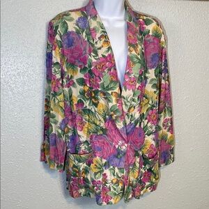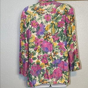 This eye-catching blazer features a vibrant floral print in pink and purple hues, perfect for making a statement. Designed with a relaxed fit and lightweight fabric, it's ideal for spring or summer wear. The classic blazer silhouette and lapel collar add a touch of sophistication to any outfit. Very good used condition. Front pockets. Not lined. No size tag, runs like a medium. Pit to pit 21”. Shoulder to hem 28”.