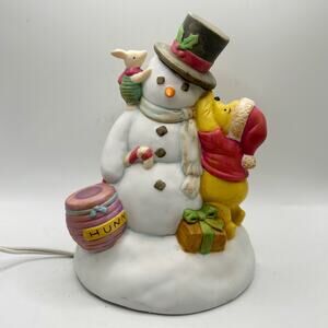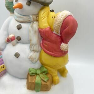 Add a touch of whimsy to your holiday decor with this charming Vintage Winnie the Pooh "Build a Snowman" Night Light Decoration. Perfect for any room, this medium-sized, white ceramic snowman figurine is adorned with the beloved Disney character Winnie the Pooh, making it a delightful addition to your seasonal collection. With dimensions of 7 3/4 inches in height and 5 inches in width, this piece is both festive and functional.