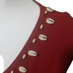 Vintage 1990s Dress Barn tank top in deep red, crafted from a luxe silk blend. Features seashell accents framing the V-neckline for a unique nautical touch. Made with 75% spun silk and 25% nylon, lightweight yet structured. Great for resort wear, summer vacations, or layering under blazers for a pop of seaside flair.