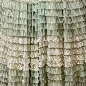 VNTG Green Cupcake Prom Dress Lace Chiffon Tiered Ruffled Strapless Gown 1950s