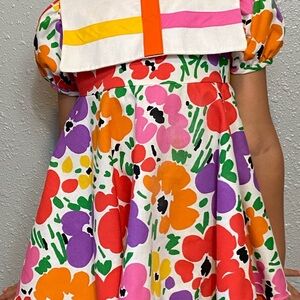 This charming sundress by Abella features a vibrant red and purple color palette, perfect for casual outings. Designed with a crew neck and puff cap sleeves, it offers a playful yet elegant look. The dress is completed with a classic peter pan collar, adding a touch of timeless style. In vintage condition, minor discoloration (refer to pictures). Size tag removed, approximately size 3.