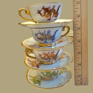 This exquisite collection of vintage Japanese teacups features intricate dragon motifs, each adorned with gold gilding. A beautiful blend of artistry and functionality, this set offers an elegant touch for any tea time. The stunning craftsmanship and historical charm make it a coveted addition to any collection or display.