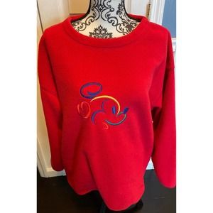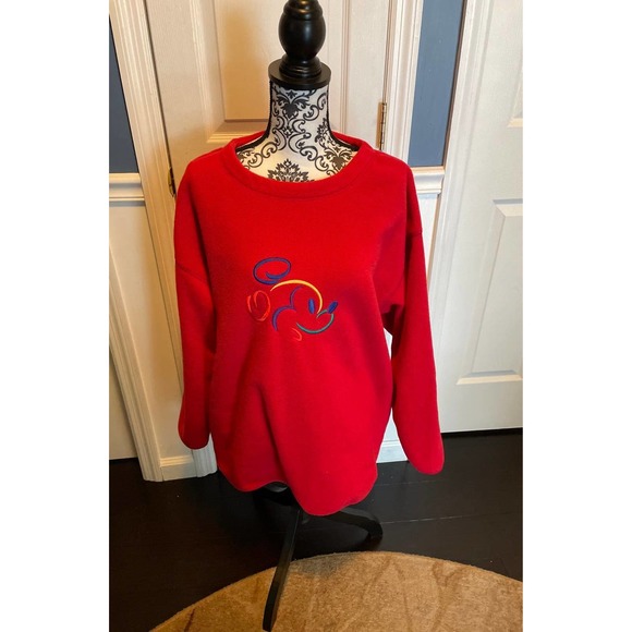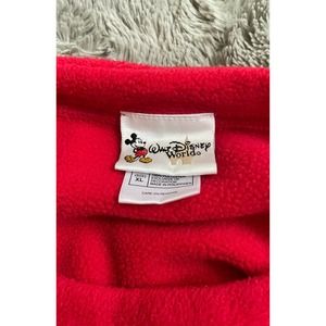 Walt Disney World red fleece pullover sweatshirt great condition no rips or stains of any kind no pulleys women’s size extra large boat neck long sleeve rich red color with embroidered Mickey face design comes from a smoke free home under arm to under arm measures approximately 25 inches in length shoulder to bottom measures 29 “