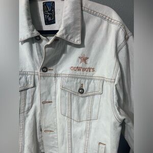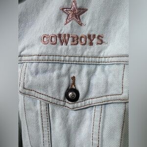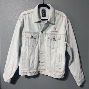 VNTG NFL Sports Dallas Cowboys Denim Jean Jacket Light Wash 100% Cotton Sz LG. Women/Unisex. Shoulder to hem 25”. Wrist to shoulder 28”. Armpit to armpit 24”. Excellent condition!!