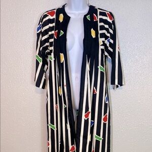 This stylish VNTG midi dress designed by Richard Sivley for Keyloun from Neiman Marcus showcases a classic black and white color scheme, with primary colors scattered throughout, ideal for casual occasions. The 3/4 sleeves and crew neck provide a comfortable and chic fit, while the dynamic design adds a modern touch. Dress is vintage. Zips down the front. Size just says petite, runs like a size small. Pit to pit 16.5”. Shoulder to hem 48.5”. Excellent condition. Not lined. Does have pockets.