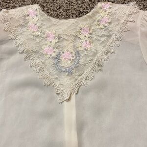 Vintage 11/12. Fits like size medium. Pit to pit 21”. Shoulder to hem 25”(front), 26.5” (back). Buttons Dôen the back. Has shoulder pads that could be cut out. Not lined. 3/4 sleeves. Lace bib front shirt,