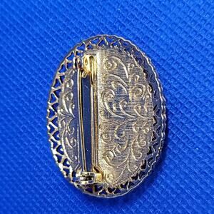 VNTG Pastel Pink Cabochon Pin With Shiny Gold Heart Filligree Trim Brand 1928