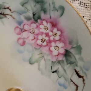 vintage lemon serving plate. delicately hand painted flowers. colors are pink, purple, blue, and greens. gold handle. no markings. 7 inch round.