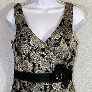 Elegant mini bubble dress with intricate gold/cream patterns. Features a flattering V-neck and fitted waist. Ideal for evening wear. VNTG. Excellent condition. Size 8. Pit to pit17.5”. Waist 14”. Shoulder to hem 36”.