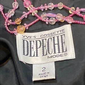 This vintage Yves Cossette for Depeche Mode chic black mini dress features a sleek sheath style with spaghetti straps perfect for a cocktail night out. The dress boasts a striking contrast with a pink beaded strands in the back, adding a touch of elegance to its sophisticated design. VGVC. Size 2. Pit to pit 16”. Shoulder to hem 33.5”.