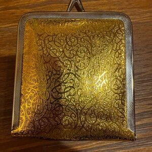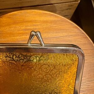 VNTG kiss lock makeup mirror gold foil design and a kiss-lock closure 1960’s
