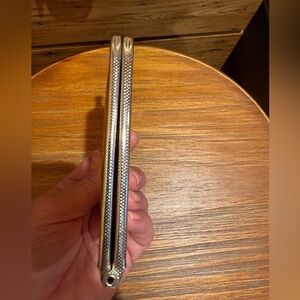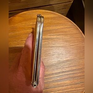 This vintage kiss lock makeup mirror is from the 1960s, featuring a gold foil design and a kiss-lock closure. These mirrors often have two mirrors inside and are compact enough to fit in a purse. Some are made with padded soft sides and metal frame. They are often considered collectible items due to their retro style and craftsmanship. Good condition. Thanks for looking!