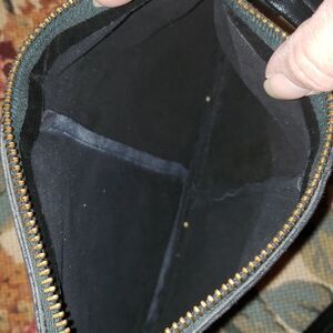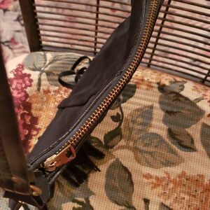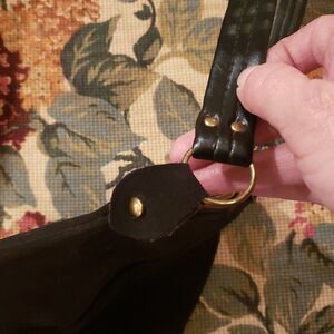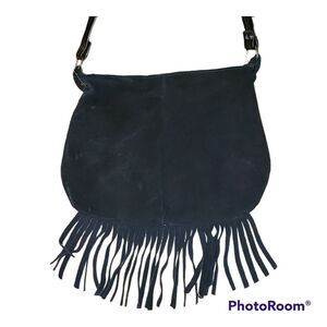 Gently used condition, vintage 50's/60's, black suede leather shell with frilly fringe dangling at bottom, single shoulder strap, general wear no major flaws or damage