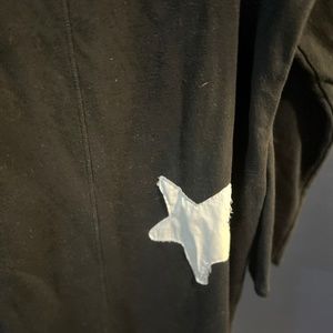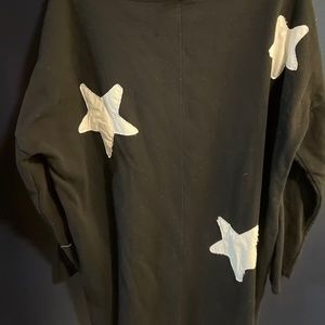 Embellished French Terry v-neck top. 28" from neck to hem. Features embroidered moon and appliqué stars. Side pockets. M/L