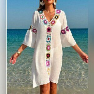 V-Neck 3/4 Sleeve Multi Color Floral Crochet Bathing Suit Cover Up White