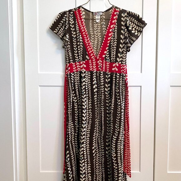 Polyester short-sleeve, V-Neck brown and red leaf pattern dress with tie at waist. Cute blue flower accents. Polyester and spandex.