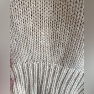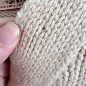 Vintage wool knit v-neck style sweater. There are some spots on the left arm and shown in photo and one super faint spot near the front center. A cream colored wool. A small space in the stitch on the collar, but not a hole. Size small.