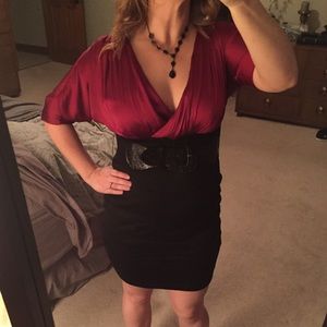 Very sexy dress for any party! Beautiful maroon top with a fitted black skirt and built in belt. Deep V neck line. Worn once to a Holiday party. Great condition. Skirt measurement: 23"
