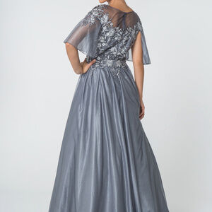 Floral and Jewel Beaded V-Neckline Cap Sleeves V-Neckline A-Line Shape Long Evening Prom Bridesmaid Dress with sheer back and zipper closer.