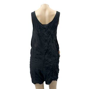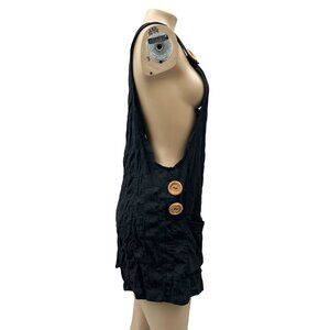 V-Neck Front Pockets Sleeveless Romper Wooden Buttons Crinkled Texture Black M