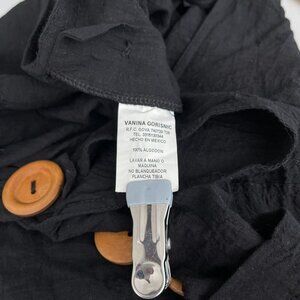 Tags: black romper, sleeveless jumpsuit, wooden button romper, casual playsuit, crinkled texture outfit, lightweight summer wear, deep v-neck romper, relaxed fit jumpsuit, cotton-linen romper, black playsuit, wooden accent outfit, front pocket romper, sleeveless black outfit