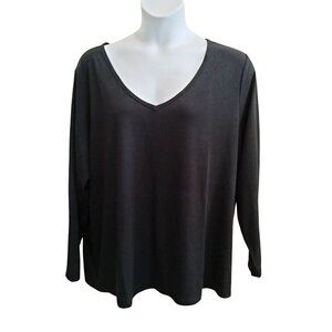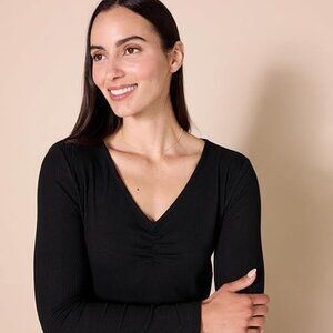 women's long sleeve, fitted v-neck top, layering top, slim fit shirt, casual knit shirt, 4X women's wear, black v-neck shirt, white v-neck shirt, plus size top, cinched front detail, ribbed knit fabric, ribbed long sleeve shirt