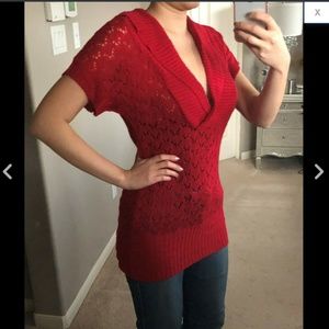 Red Open Knit Eyelet Lace Plunging Sweater Top M