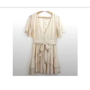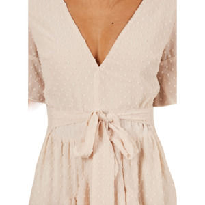 V-Neck RUFFLED Beige Swiss Dot Mini Dress - Showpo - Size 6