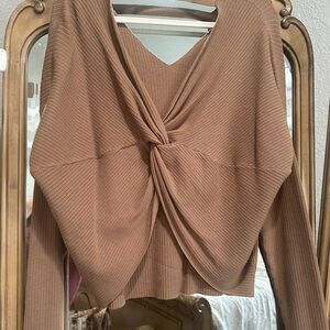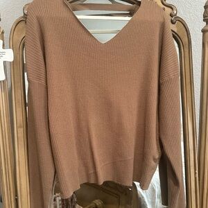Stay cozy and stylish with this ribbed V-neck sweater. Perfect for any occasion, this brown sweater adds a touch of elegance to your wardrobe. No tag size but fits like a medium. Cross back. Very soft and warm.