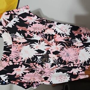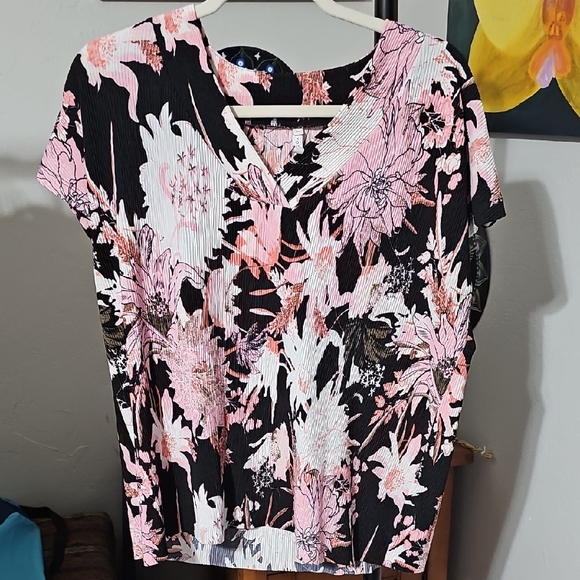 Elevate your wardrobe with this stylish floral V-neck top. Featuring a beautiful blend of pink and black and a fabulous texture, this top is perfect for any occasion. Pair it with your favorite jeans or skirt for a chic look.