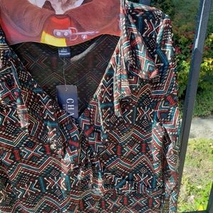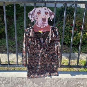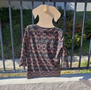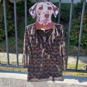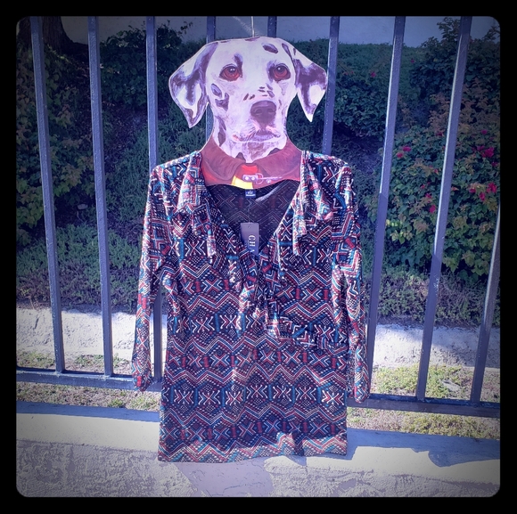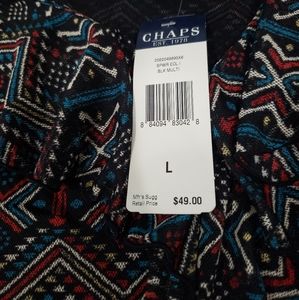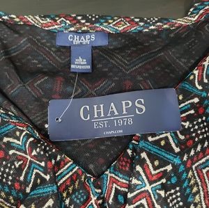 Ruffle front V-Neck blouse by Chaps. Brand new with tags. No flaws noted. Black background with cream, red, turquoise, and mustard yellow beautiful pattern. Measurements are pit to pit-21 inches and length is 26 inches.