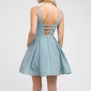 Short Formal Evening Dresses with v-neckline, sleeveless dress, open v-back with zippered closure, a-line shape.