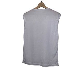 White is v-neck tank, sleeveless, slight cap sleeve top. Longer able to be tucked in or great over leggings.