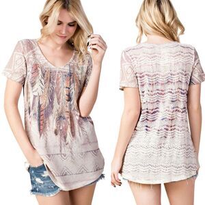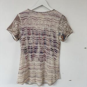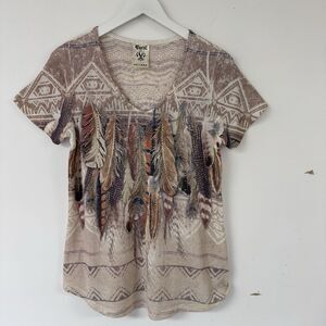 VOCAL Knit Feather Print Beaded Rhinestone Short Sleeve Top Boho Chic Small EUC